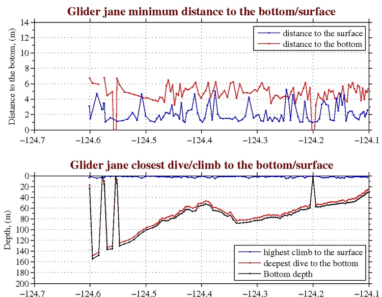 Temperature, Salinity,<br>and Density Temperature, Salinity,<br>and Oxygen Chlorophyll, CDOM,<br>and Backscatter Closest Dive/Climb to<br>the Bottom/Surface