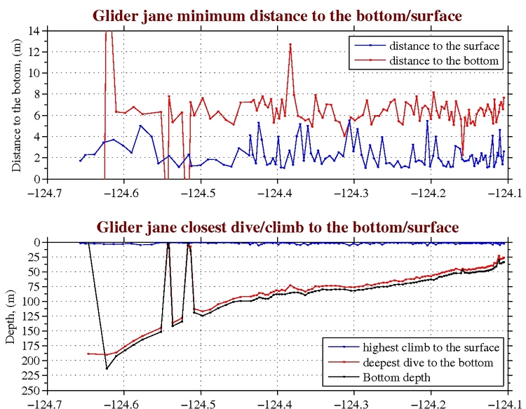 Temperature, Salinity,<br>and Density Temperature, Salinity,<br>and Oxygen Chlorophyll, CDOM,<br>and Backscatter Closest Dive/Climb to<br>the Bottom/Surface